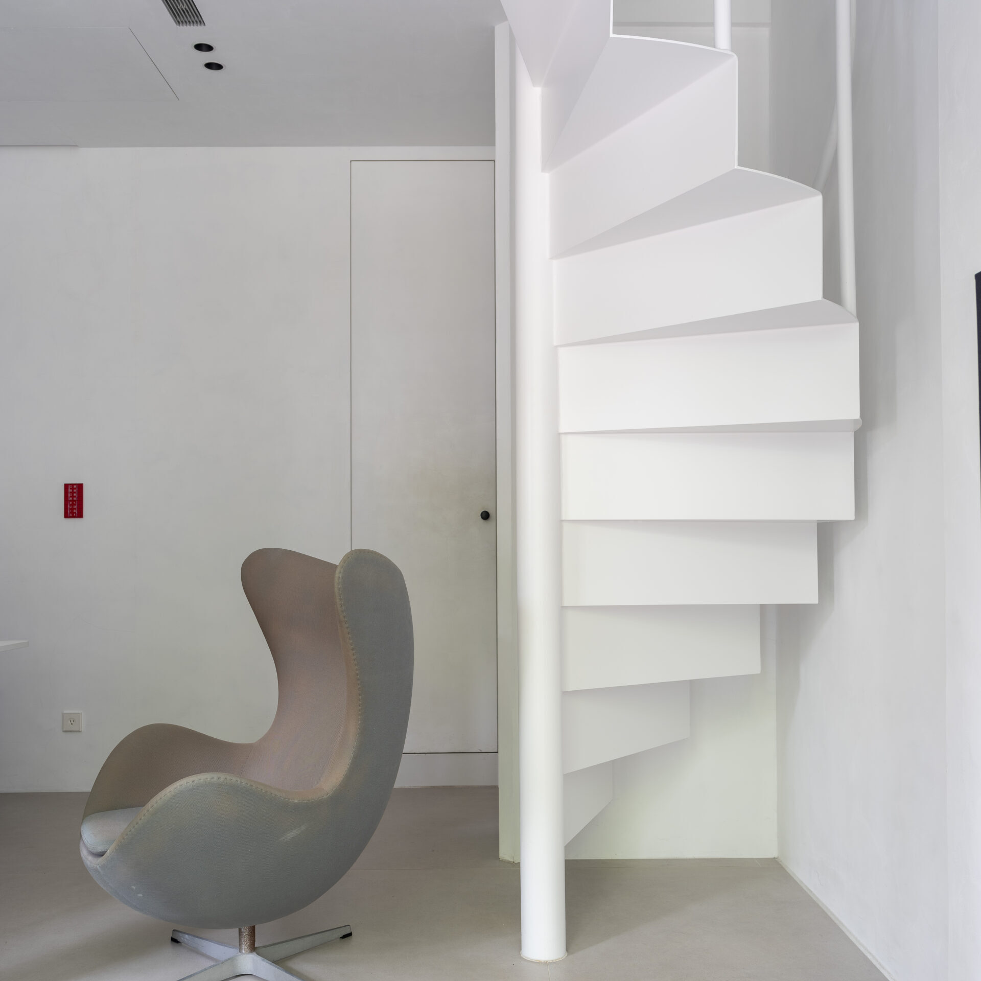 此案子為辦公室設計,基地位於法院後街,面向自然路樹,以落地窗引光入室,一天的光影變化將延伸至空間。整體色系以白為基底,如同一幅空白畫布,等待使用者為其添上色彩。空間亮點為,摺紙手法的旋轉樓梯。上行時為順時針,腳步輕快,引領至安心的閱讀與蒐藏空間;下行時為逆時針,步伐隨之放慢,緩緩沉澱,回到專注工作的場域。 Photography by Kyle Yu Studio / Kyle Yu